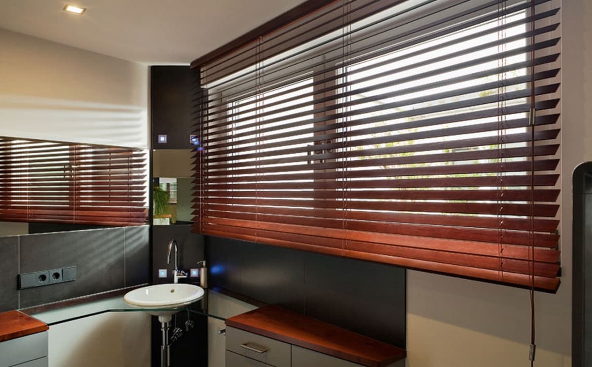 - Минимализм. Деревянные белые горизонтальные жалюзи здесь поддерживают концепцию чистого, незагроможденного пространства. Обеспечивают функциональность (контроль освещения) без лишних деталей, органично вписываясь в общую эстетику.